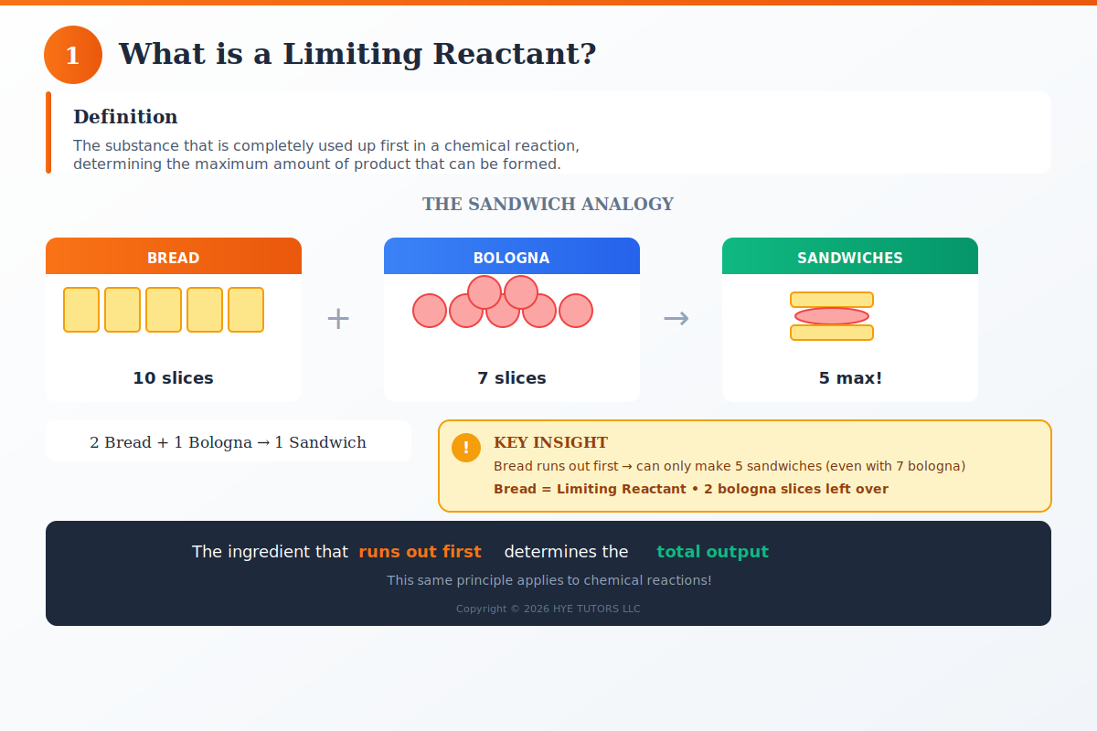 In chemistry, the limiting reactant is the substance that gets completely used up first, stopping the reaction from continuing. Think of it like running out of bread when making sandwiches—even if you have plenty of cheese and meat, no bread means no more sandwiches. The limiting reactant controls the maximum amount of product your reaction can produce, which is why understanding how to find the limiting reactant is essential for stoichiometry success.