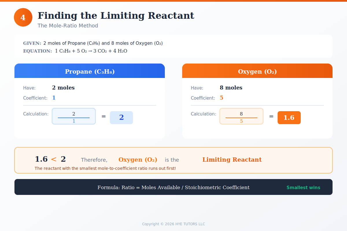 Solution: Divide each reactant's moles by its coefficient. For hydrogen: 4 mol ÷ 2 = 2. For oxygen: 3 mol ÷ 1 = 3. Since hydrogen has the smaller ratio (2 < 3), hydrogen is the limiting reactant. Oxygen is in excess.