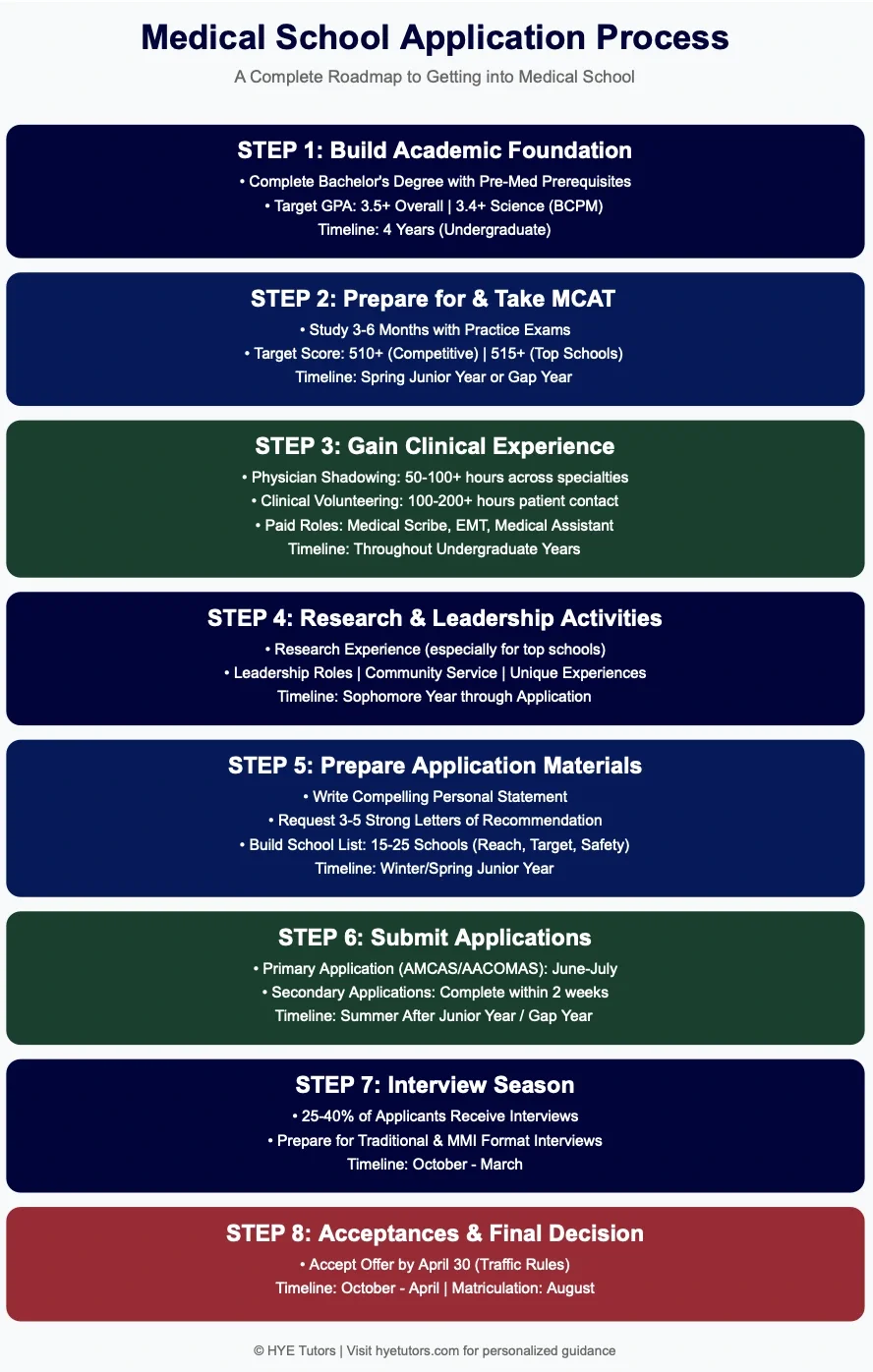 Following a structured approach to how to get into medical school dramatically increases your chances of acceptance. Here's a comprehensive roadmap to guide you from freshman year through matriculation.