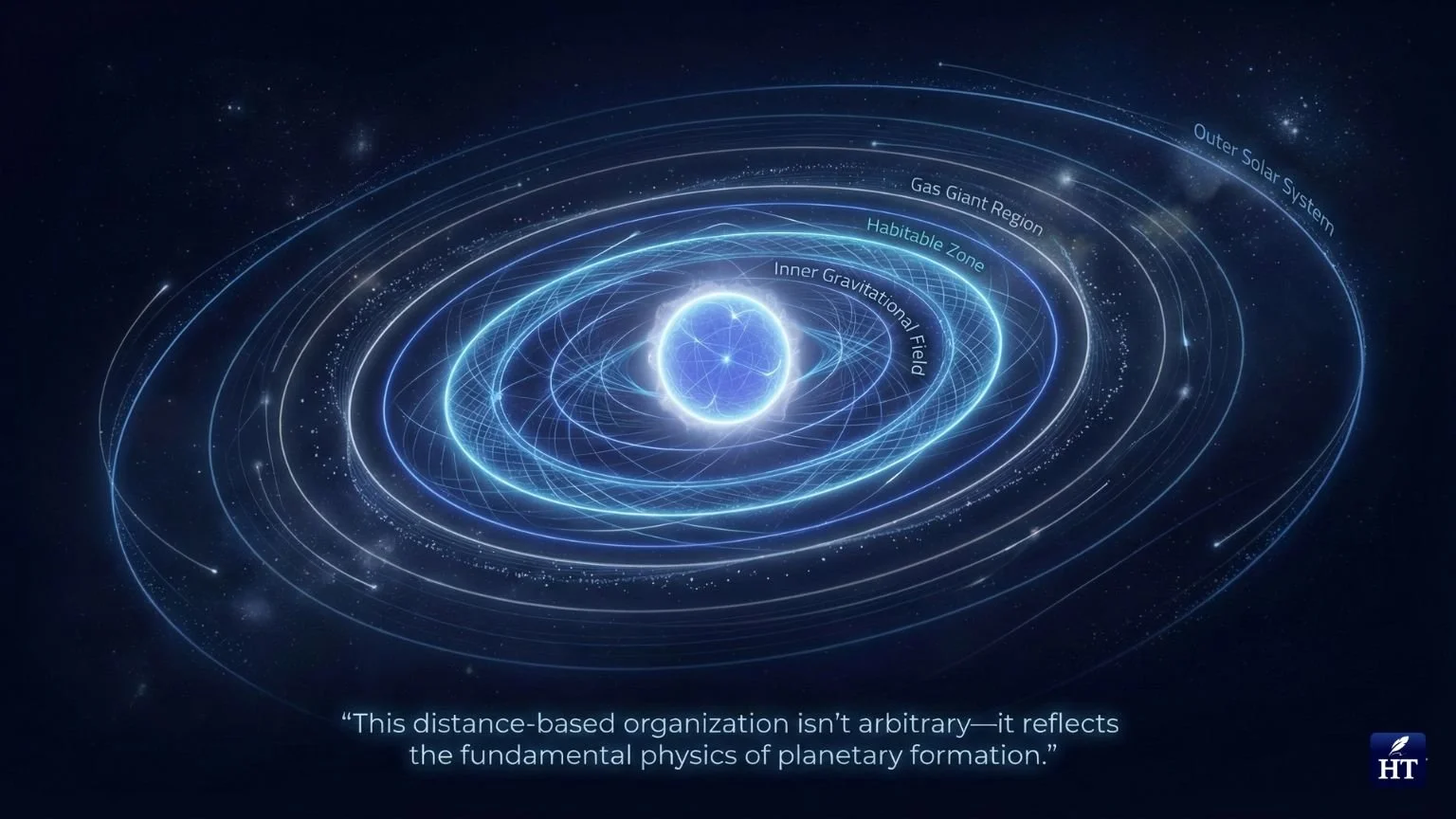 The Sun's gravitational influence weakens with distance, creating distinct orbital zones where different types of planets could form. Closer to the Sun, where temperatures were higher, only rocky materials could condense, forming the small, dense terrestrial planets. Farther out, where it was cooler, ice and gas could accumulate, allowing the formation of massive gas giants and ice giants. This distance-based organization isn't arbitrary—it reflects the fundamental physics of planetary formation.