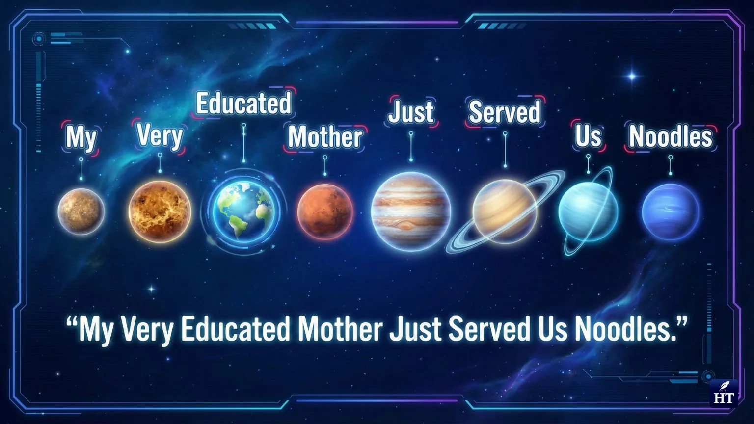 Each word's first letter corresponds to a planet in order: