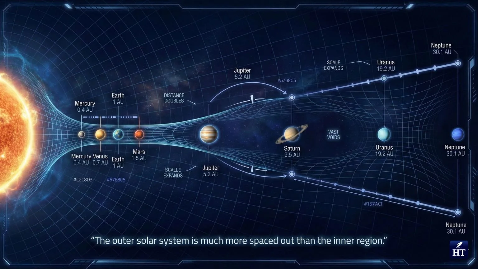 Notice how the gaps between planets increase as you move outward. Mercury to Venus is about 0.33 AU, but Uranus to Neptune is about 10 AU. The outer solar system is much more spaced out than the inner region, reflecting the different conditions under which planets formed at various distances from the young Sun.