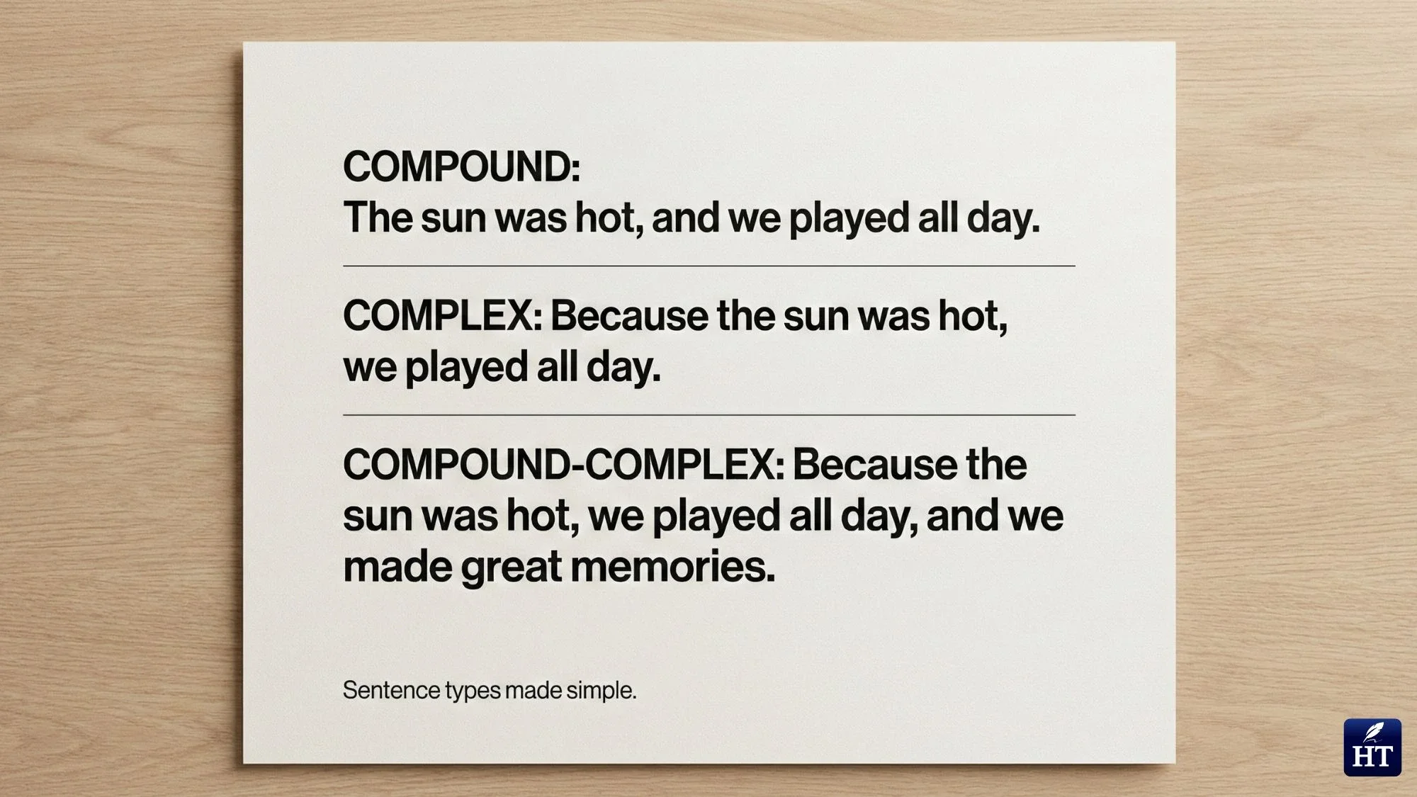 Many learners confuse compound sentences with complex sentences and compound-complex sentences — and honestly, the names don't make it easy! But here's the good news: once you understand the simple logic behind each type, the differences become crystal clear.