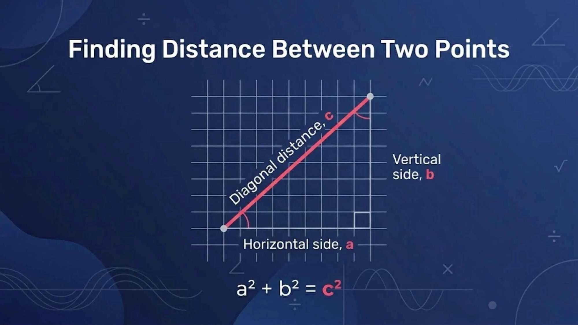 “The Pythagorean theorem is used to calculate the distance between two points and to find missing side lengths in right triangles. It is applied across construction, navigation, engineering, physics, and computer graphics — any time accurate measurement is needed and direct measurement isn’t possible.
