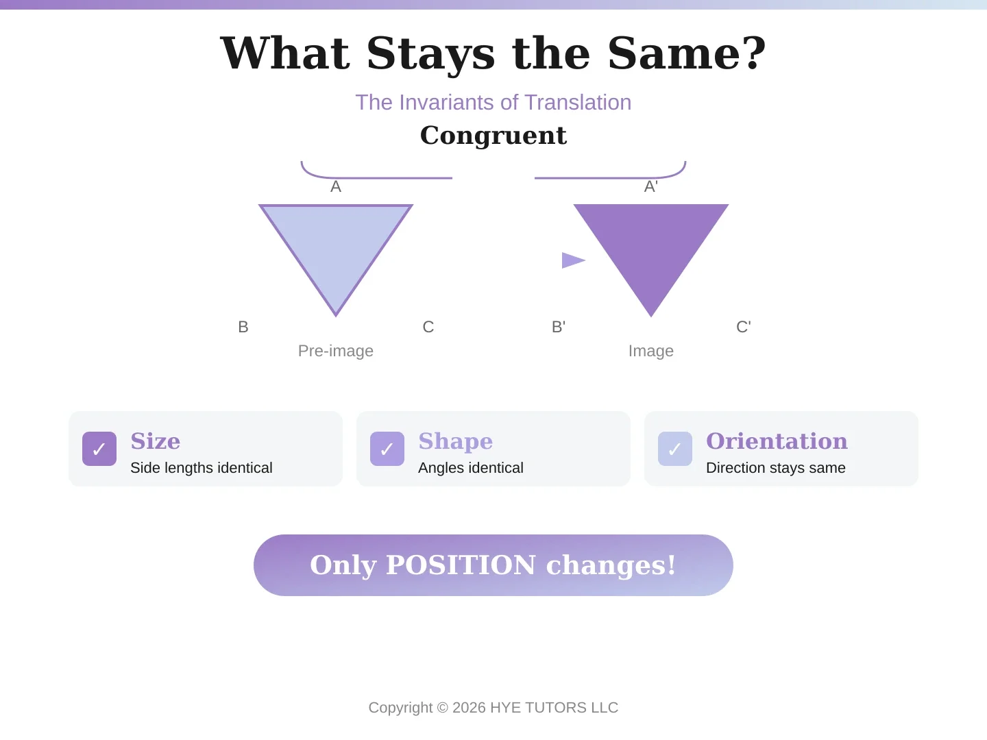 When you translate a shape, three things always stay the same: its size, its shape, and its orientation (which way it faces). A triangle translated five units to the right is still the exact same triangle—same angles, same side lengths, same direction. The only thing that changes is where it sits on the coordinate plane.
