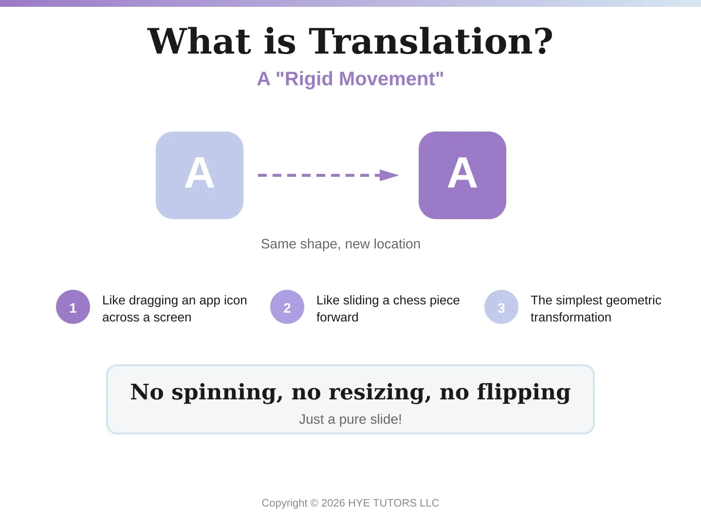 This is what makes translation different from other transformations. There's no spinning (that's rotation), no flipping (that's reflection), and no stretching or shrinking (that's dilation). Translation is pure sliding motion—predictable, measurable, and consistent.